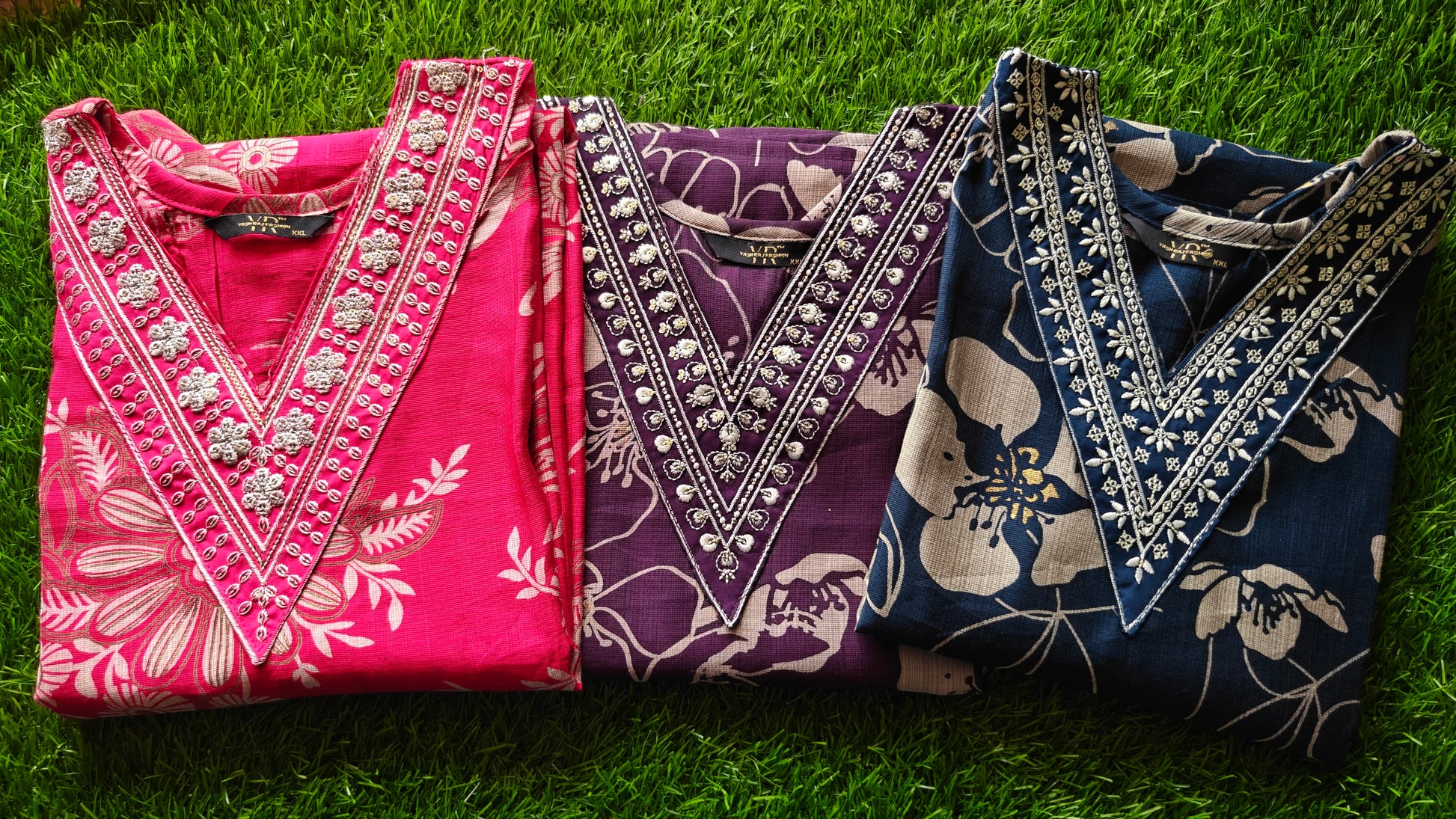 | Colour | Pink, Dark Purple, Dark Blue with Floral designs |